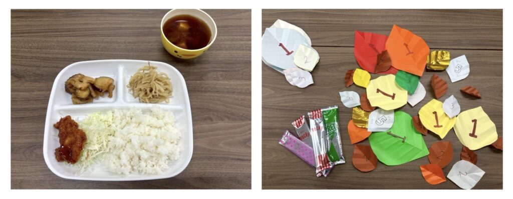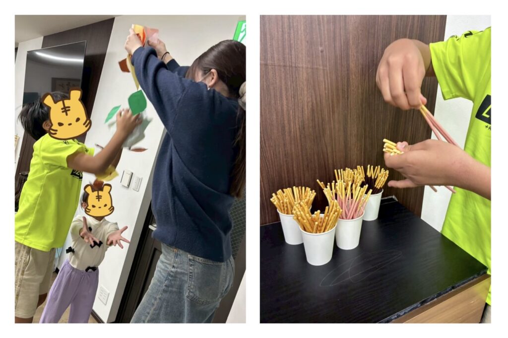 (左)落ち葉キャッチゲームを楽しむ子どもたちの様子 (右)キャッチ出来た分だけポッキーをゲットする様子