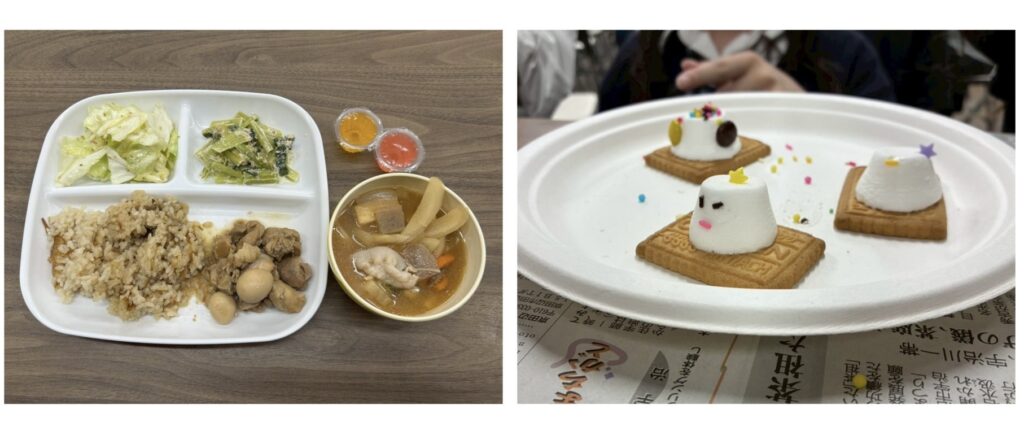 今回のメニューは炊き込みご飯、鶏とウズラ卵の煮物、キャベツの胡麻和えサラダ、小松菜のツナ和え、豚汁でした!大きな具材がゴロゴロと入った豪華な豚汁は、子どもにも保護者にも大人気でした。また、今回のデザートであるフルーツゼリーの味を楽しそうに選ぶ子どもたちの姿がとても印象的でした。