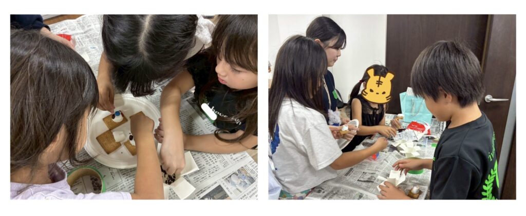 そして今回私たちが企画したのは、お化けに見立てたマシュマロ作り!クッキーの上に乗せて30秒ほどレンジでチンすると、マシュマロがとろりと溶けてまるでハロウィンのお化けのよう👻レンジから取り出した後は、チョコスプレーやマーブルチョコなどで自由に飾りつけしてもらいました♪